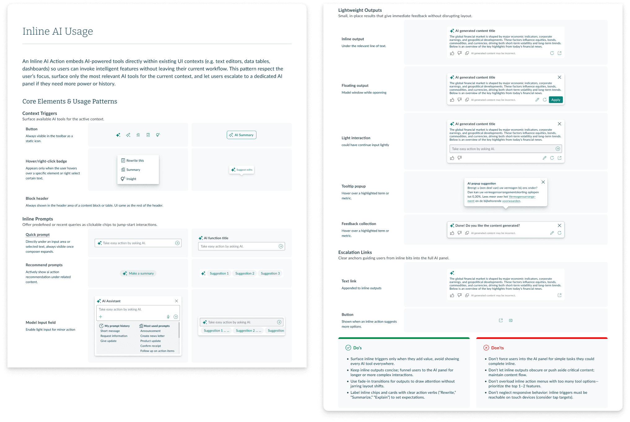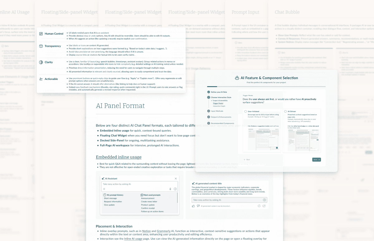 Based on the research, I developed three interlocking deliverables to ensure AI features are trustworthy, usable, and well-integrated. This allows product teams to assemble AI features that are consistent in design, and tailored to the specific requirement of the task.