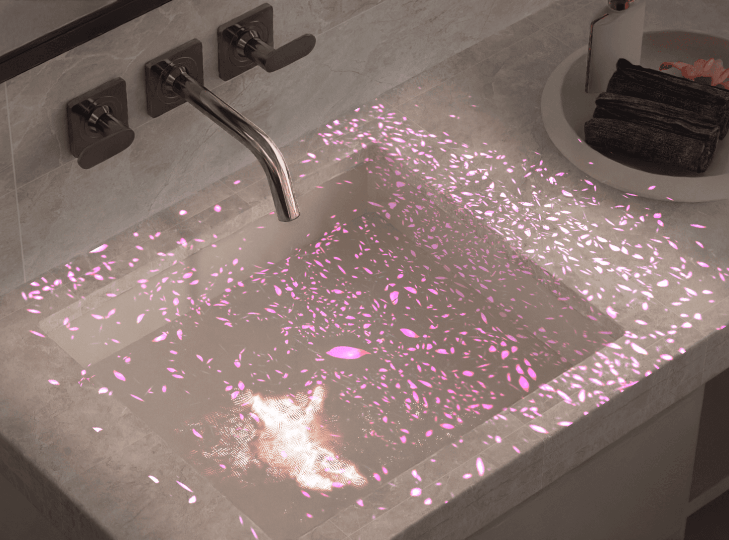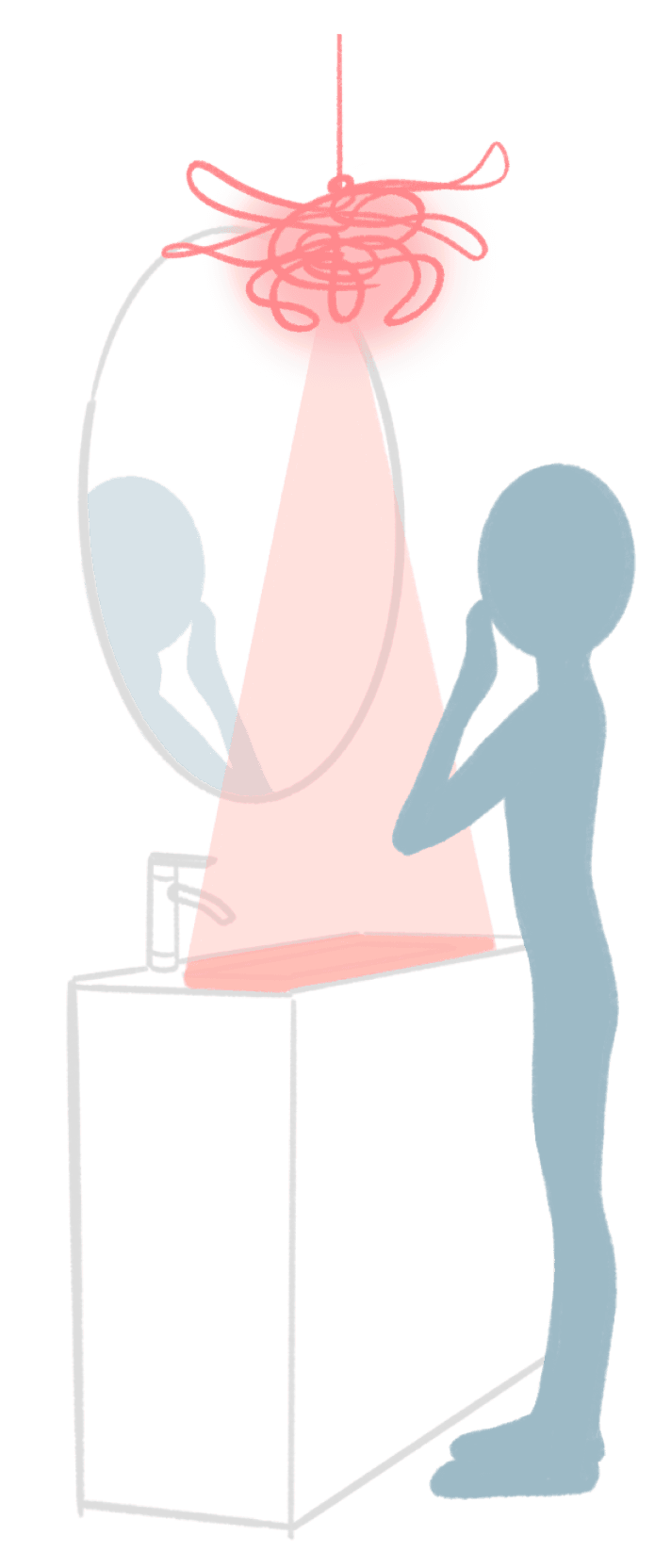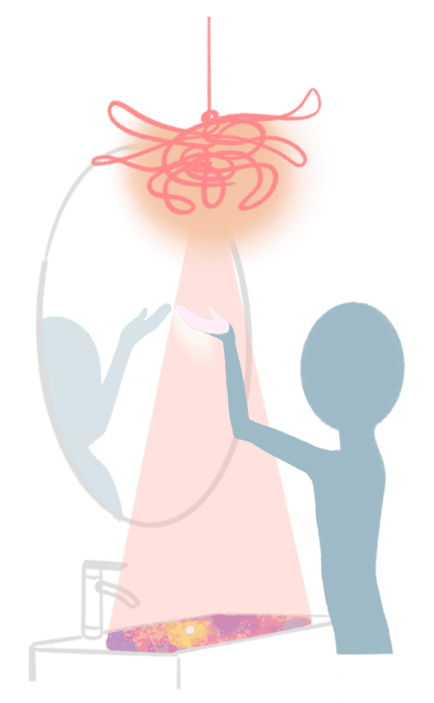 Hanging in front of the mirror, projected in the sink